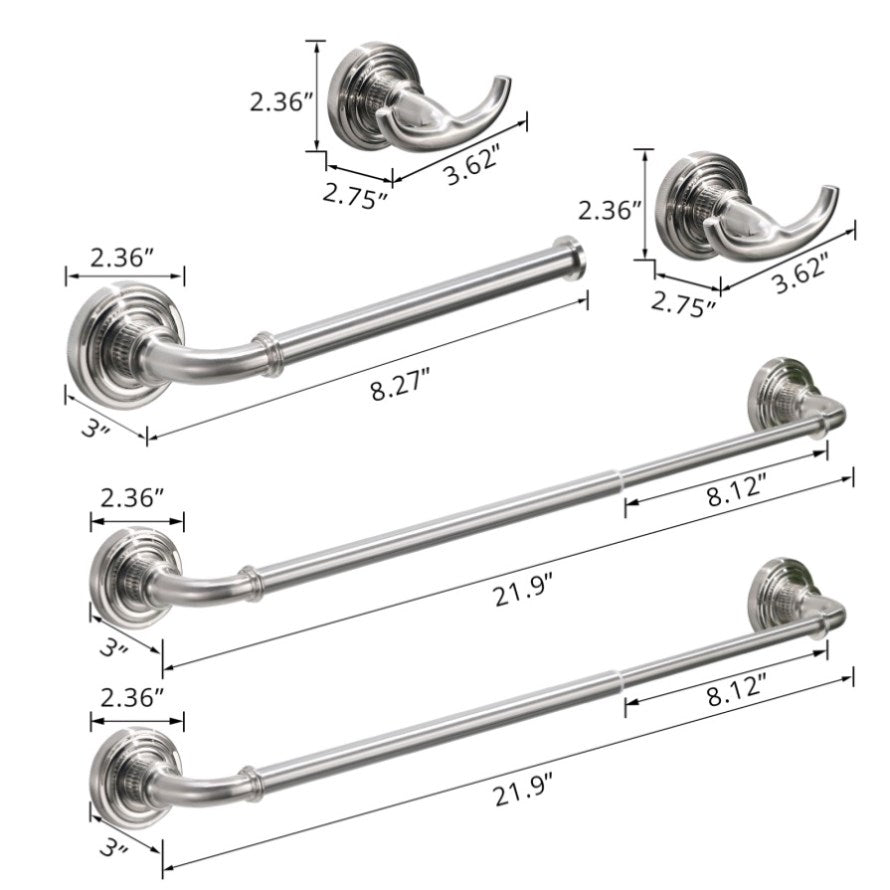 5 Piece Kit- 24 inches towel bar,toilet paper holder, robe hooks. One complete towel hanger set meet all your need in daily life.