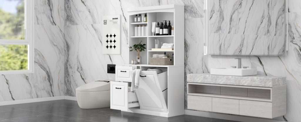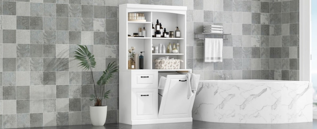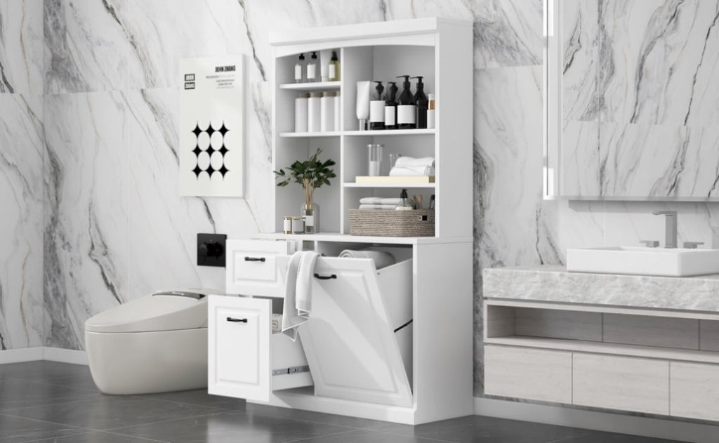 | Hidden Hamper for Effortless Clean-Up | No more exposed laundry—simply tilt out the front panel and toss in towels or garments. |
