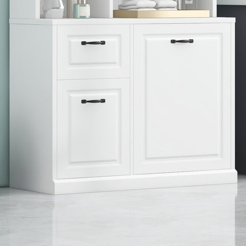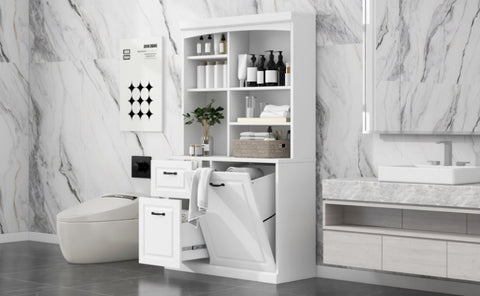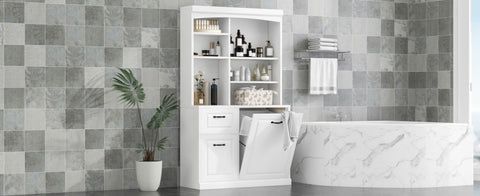 Spacious Tilt-Out Hamper: Large tilt-out compartment with a built-in storage basket is ideal for holding towels, bath linens, or daily laundry.