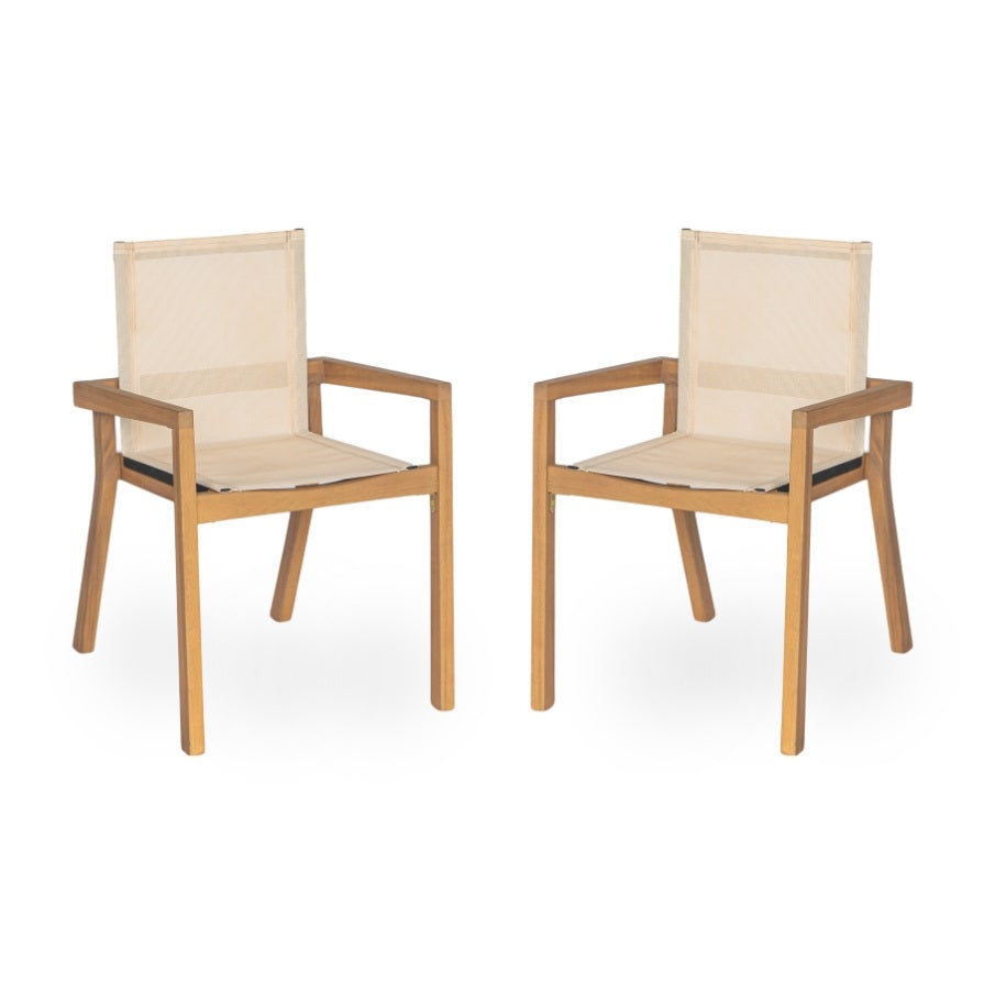 Versatile Outdoor Seating: These mesh and wood dining chairs are perfect for any outdoor dining setup. Crafted with durable acacia wood frames and sleek beige mesh seating, they're ideal for poolside gatherings or main dining areas.