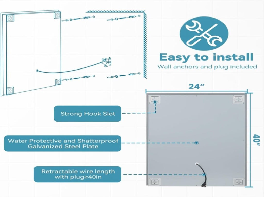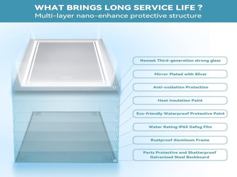 Double ProtectionSilver-sand sprayed aluminum frame, galvanized metal backboard water rating IP44 protects the LED light. It will prevent the components inside corrosion and prevent mirror deformation in humid environments, which makes it a longer service life.