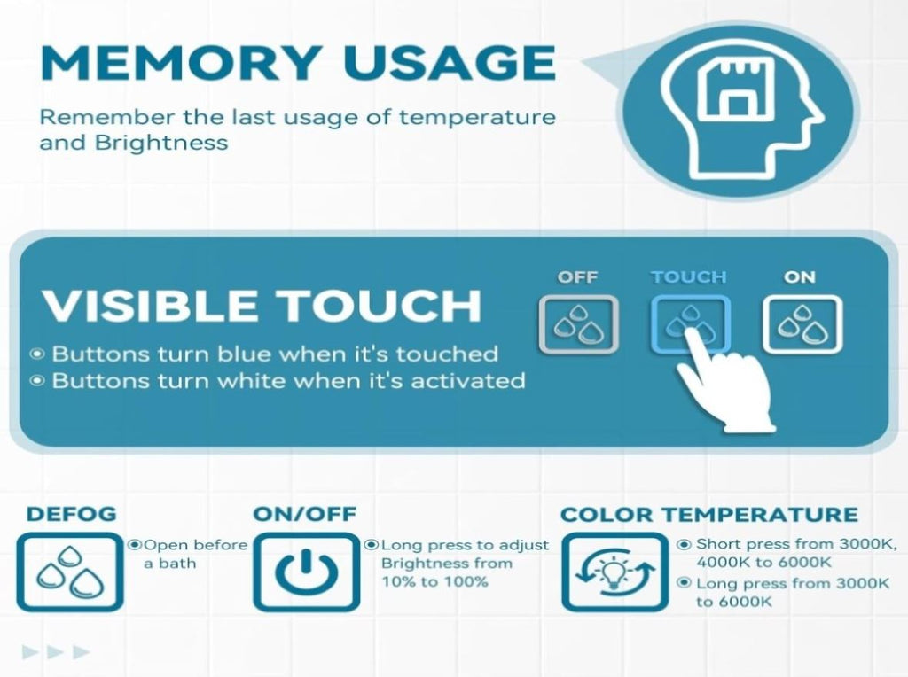 1 Finger within ReachVia the light button, 3 Colors temperature can dimmable from 3000K to 6000K, can also adjust different brightness from 10% to 100% as you needs.