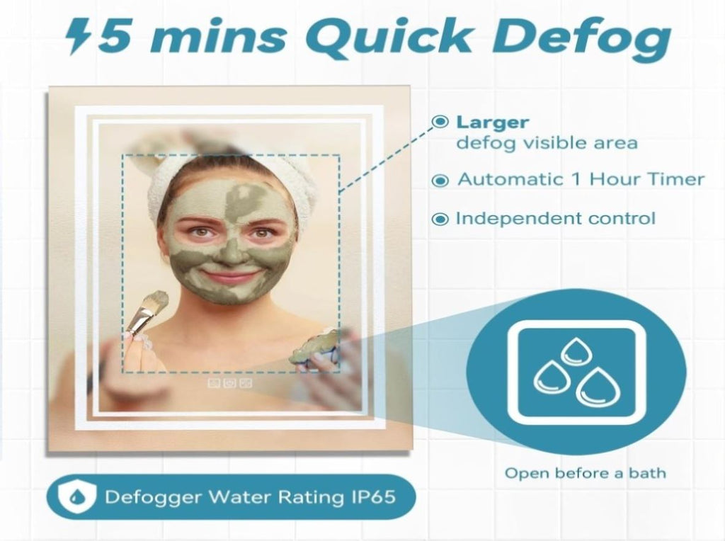 5-mins Quick DefogUL listed mirror defogger with wider defog area, you can own clear reflections after shower no need to wipe off mist with hands. Water rating IP65 makes it better anti-wet performance.