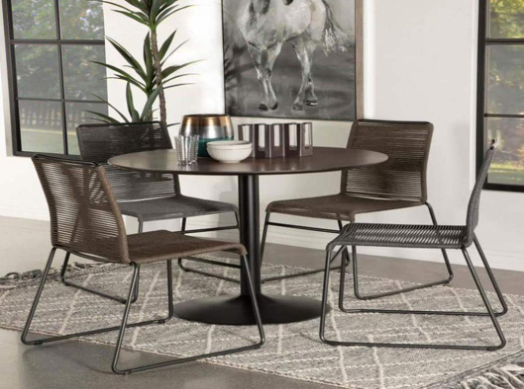 Boasts a walnut tabletop finished in a rich brown hue, providing a warm and inviting surface for dining activities