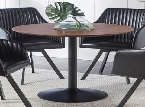 Lend casual style to your dining area with this chic Shelburne pedestal table. Designed for small spaces, this table has a simple design yet can comfortably seat four people, making it perfect for a breakfast nook or a studio apartment. A round table top lends a welcoming look to your dining area, and the pedestal base ensures plenty of legroom and stability. The black base and walnut-finished table top give this table a warm rustic style that blends easily with traditional or contemporary decor.