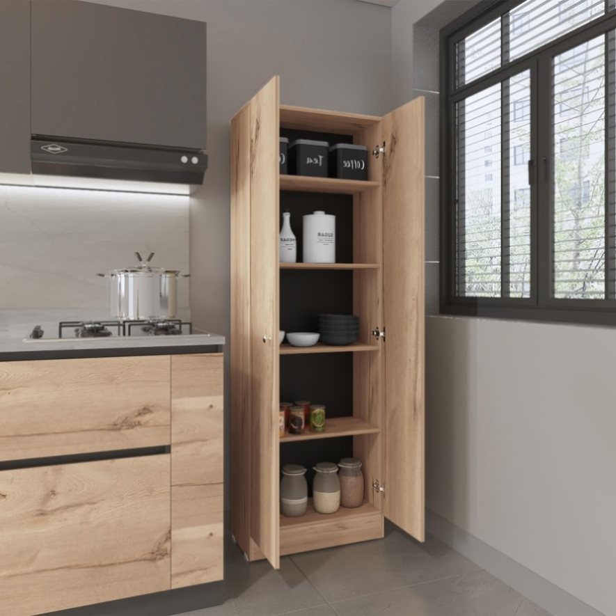 The combination of Light Oak and Black Wengue creates a striking contrast, blending warm, natural wood tones with deep, contemporary black for a modern look. This cabinet features two doors for easy access, a classic rectangular shape that fits various spaces, and five interior shelves for ample and flexible storage, ensuring a clean and organized appearance.