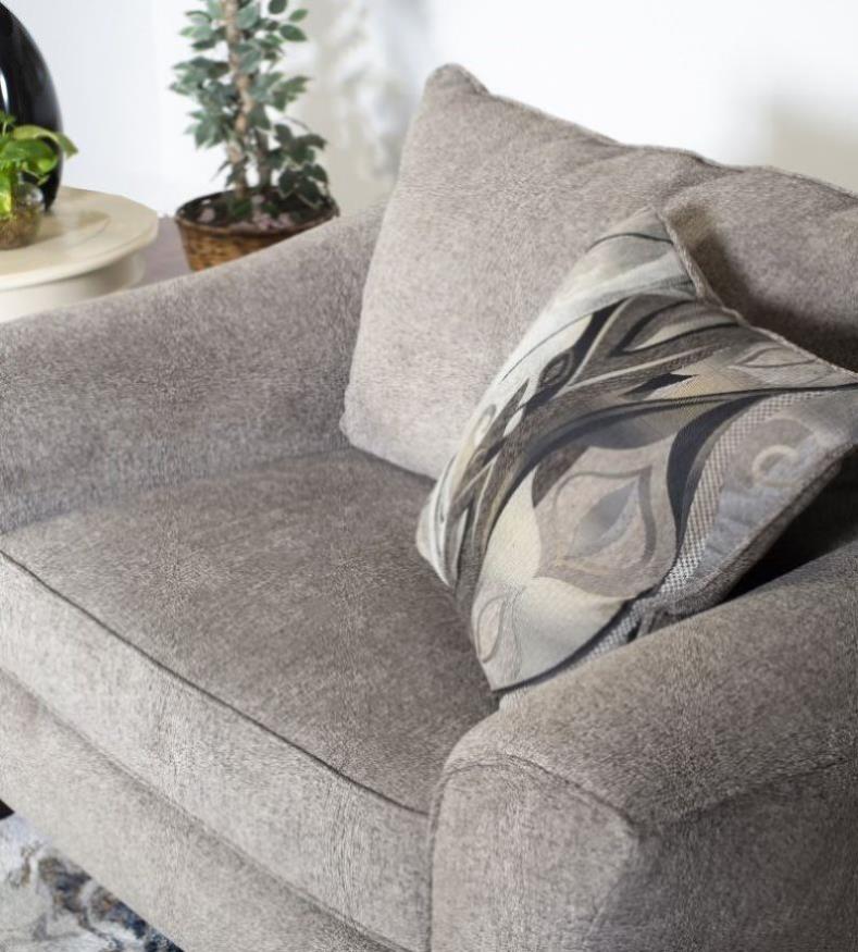 Textured gray fabric upholstery with overstuffed back cushions to provide comfort, throw pillow included