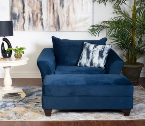 Create a casual chic living room with this Camero Contemporary Fabric Accent Chair and Ottoman Set. Its rich navy blue upholstery is accented with welted trim. Slightly rolled arms, a pillow style cushioned back, and patterned accent pillow make this chair complete. High-density seat cushions top sinuous springs and a hardwood frame for a perfectly comfortable chair in style.