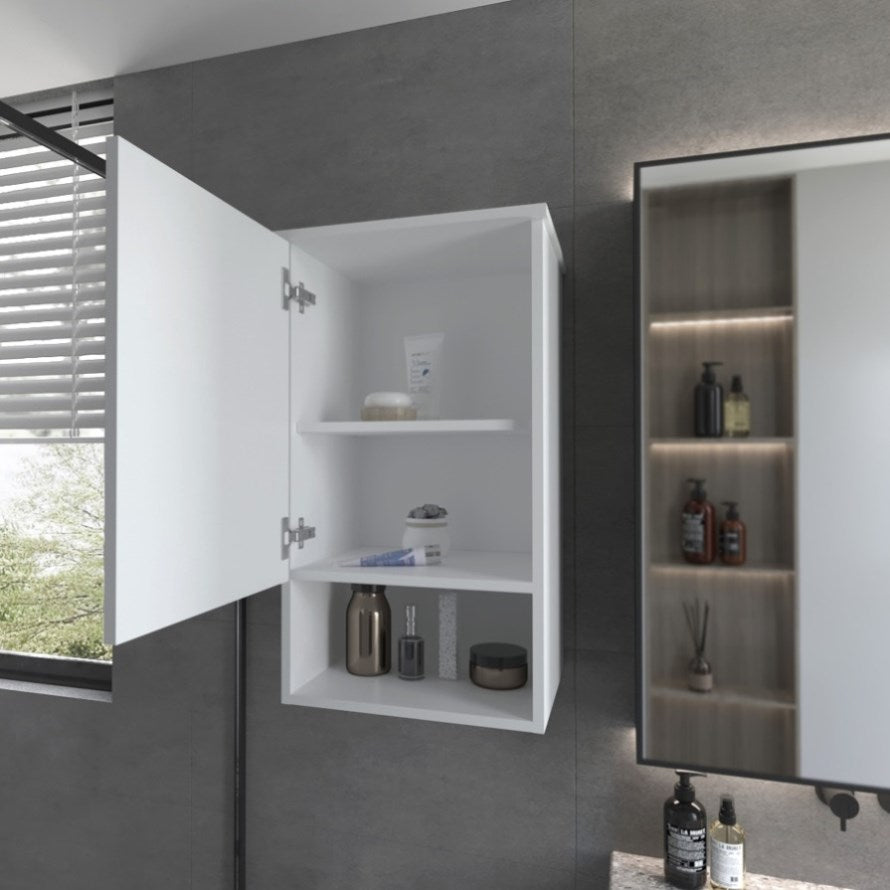 "Maximize organization in your bathroom with our recessed medicine cabinet, designed to provide a discreet and stylish storage solution. This cabinet features a door that opens to reveal two internal shelves, ideal for securely and neatly storing pharmaceuticals and first aid supplies. Additionally, it includes an open shelf at the bottom, perfect for placing everyday items or decorative pieces. Crafted with high-quality materials, our medicine cabinet is the perfect addition to keep your bathroom tidy while complementing any decor style.