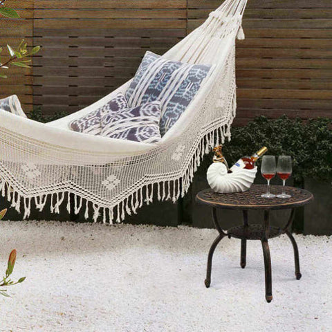 Elevate the aesthetics of your outdoor space with the exquisite design and captivating beauty of this Cast Aluminum Outdoor Side Table. Crafted with meticulous attention to detail, this table features an enchanting hollowed pattern on the tabletop, creating a stunning focal point that will impress your guests. The antique bronze finish adds a touch of vintage charm, while the sturdy cast aluminum construction ensures durability and longevity. Whether placed on your garden, porch, balcony, or indoor area, this table effortlessly blends elegance with functionality.