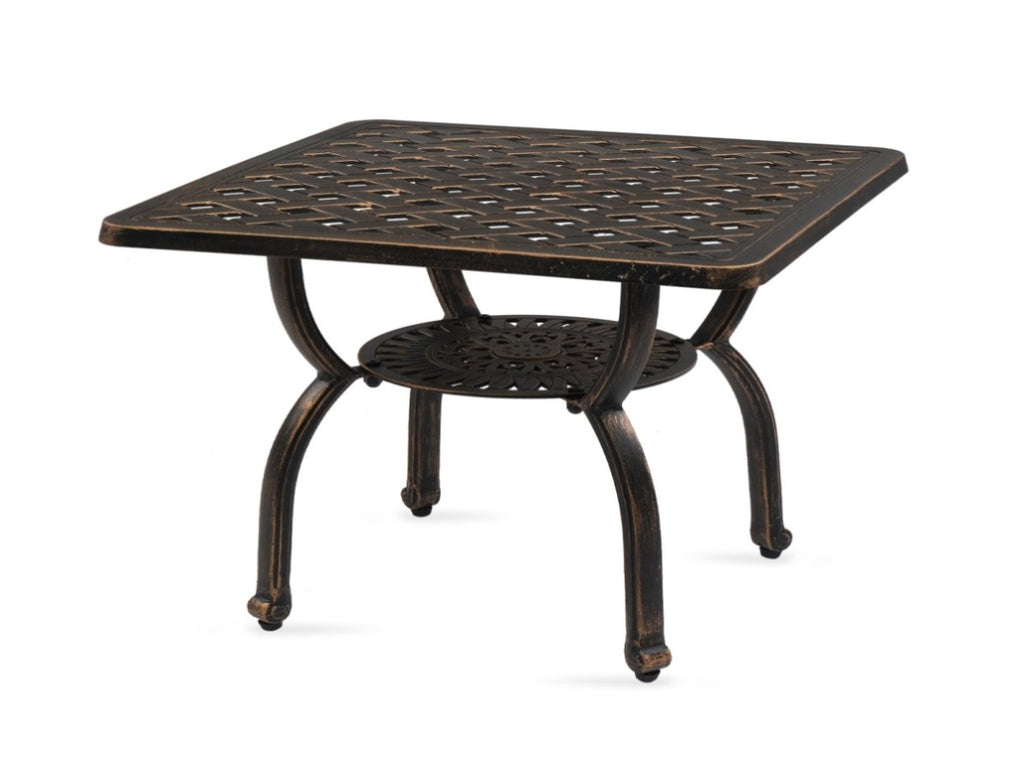 Elevate the aesthetics of your outdoor space with the exquisite design and captivating beauty of this Cast Aluminum Outdoor Side Table. Crafted with meticulous attention to detail, this table features an enchanting hollowed pattern on the tabletop, creating a stunning focal point that will impress your guests. The antique bronze finish adds a touch of vintage charm, while the sturdy cast aluminum construction ensures durability and longevity. Whether placed on your garden, porch, balcony, or indoor area, this table effortlessly blends elegance with functionality.