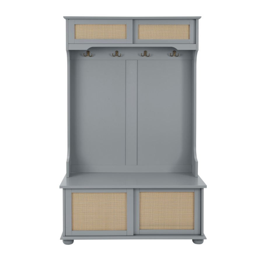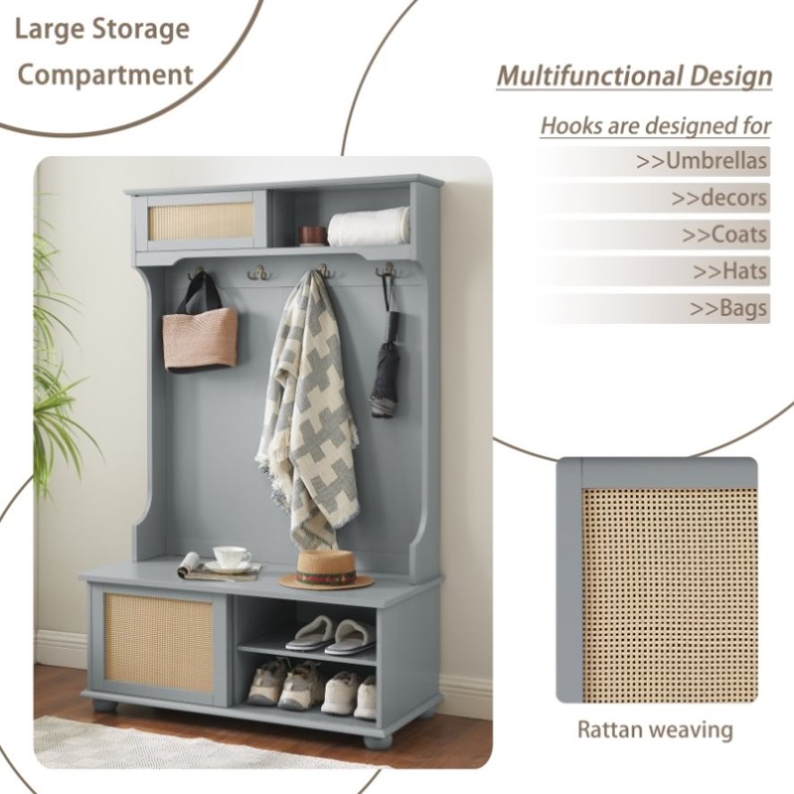 Casual Style Hall Tree Entryway Bench with Rattan Door Shelves and Shoe Cabinets, SOLID WOOD Feet, W1758126925