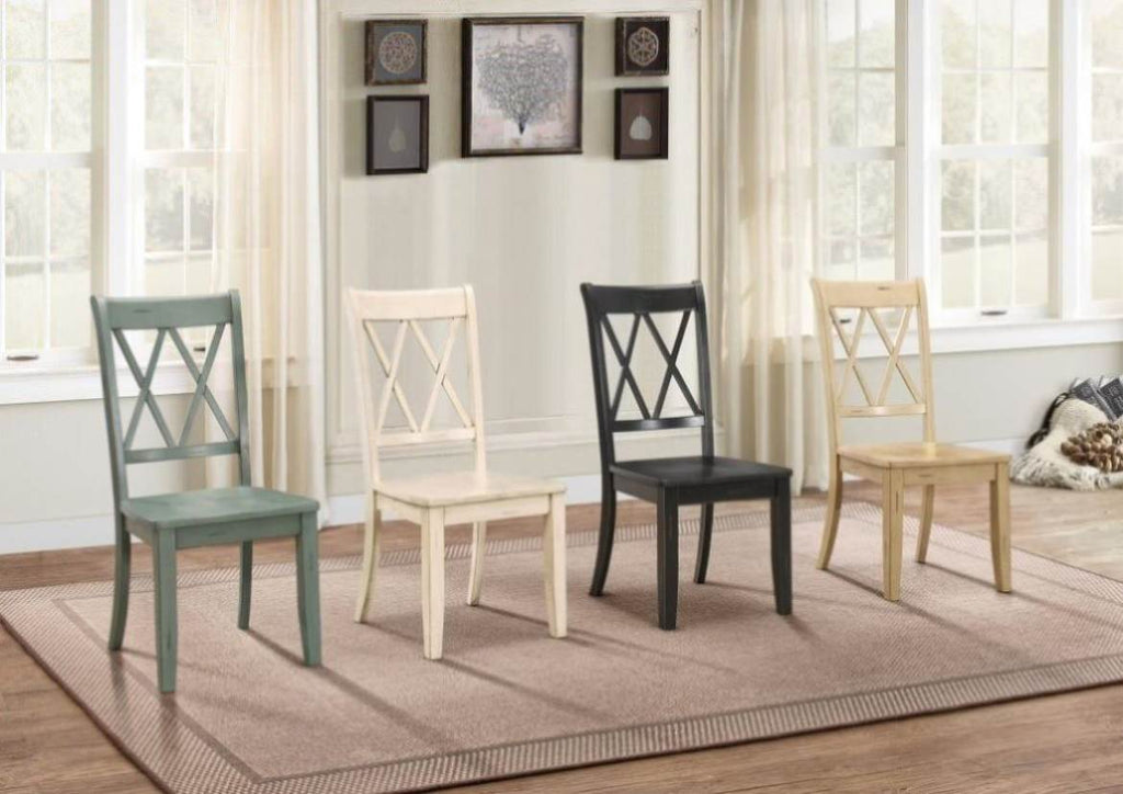 At home in a casual country setting, the Janina Collection allows for a customizable look to match the décor of your dining space. The teal finish of the side chairs pine veneer complements its transitional double-x back design and allows for unique accent to your dining room.