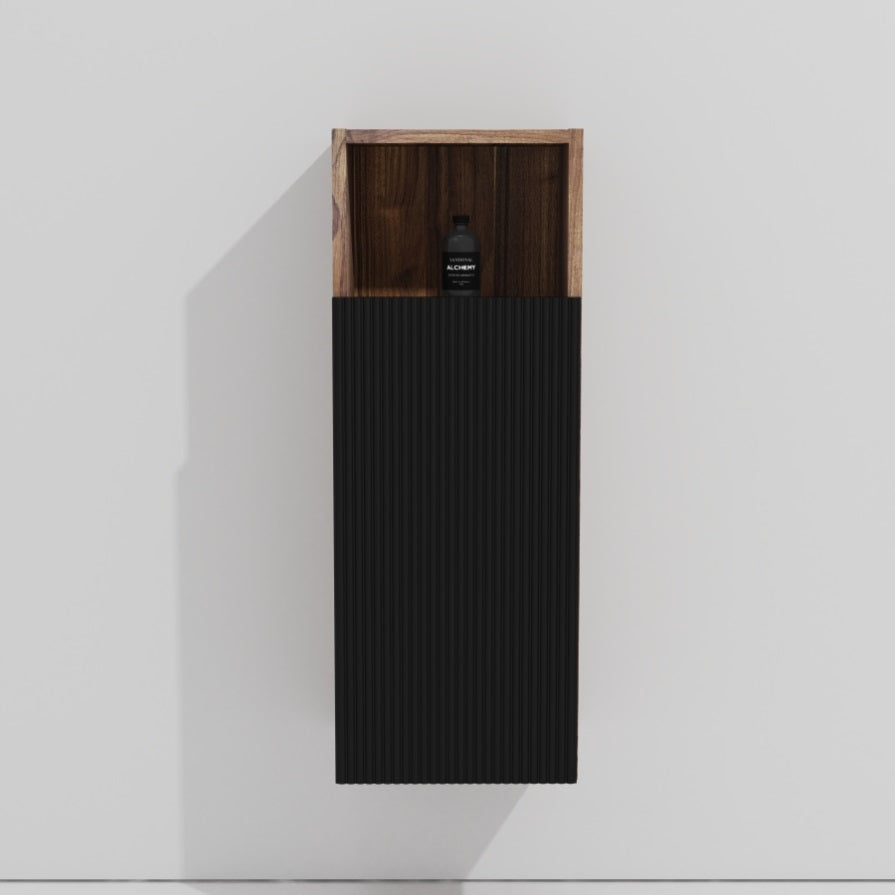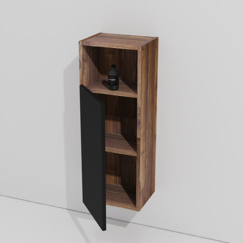 [Mid-Century 14-inch Wall mounted Storage Cabinet] This storage cabinet features a unique black grille panel and walnut color splicing. that can be combined and used in various spaces such as living rooms, bathrooms, and bedrooms. A perfect blend of practicality and elegance for any room.