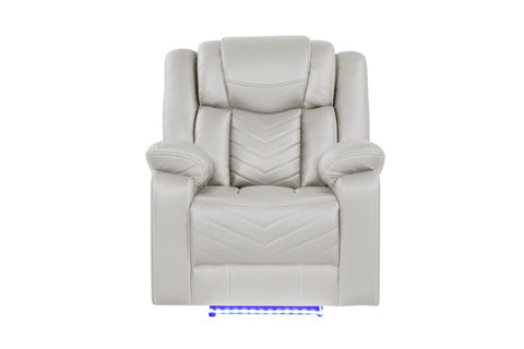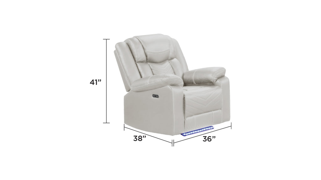 Unwind in style with this sleek power reclining chair, designed for both comfort and convenience. Upholstered in premium faux leather, this chair features refined accent stitching. The power reclining function allows you to effortlessly adjust to your perfect position with the touch of a button. Built-in USB ports keep your devices charged and within reach, while the integrated LED lighting at the base adds a modern touch, creating the perfect ambiance for any space.