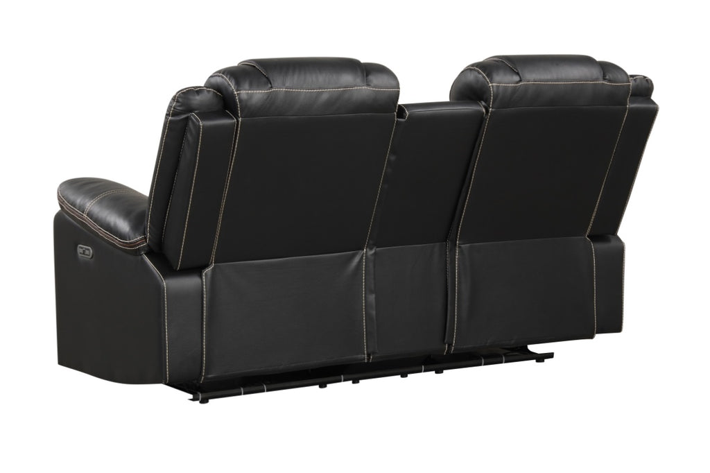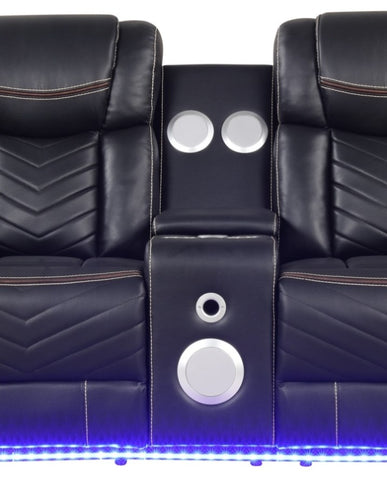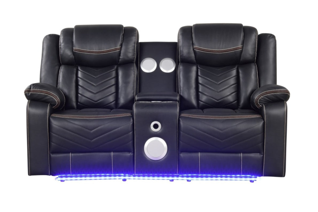 Upgrade your relaxation experience with this stylish power reclining loveseat, designed for modern comfort and entertainment. Upholstered in premium faux leather, this loveseat features a sleek contrasting accent detail. Built-in Bluetooth speakers deliver immersive sound, making it perfect for movie nights or music streaming. The center console includes two cup holders and a hidden storage compartment to keep essentials close at hand. Power reclining functionality lets you find your perfect lounging position, while integrated USB ports ensure your devices stay charged. Completing the design, LED lighting at the base adds a stylish, ambient glow for a cinematic touch.