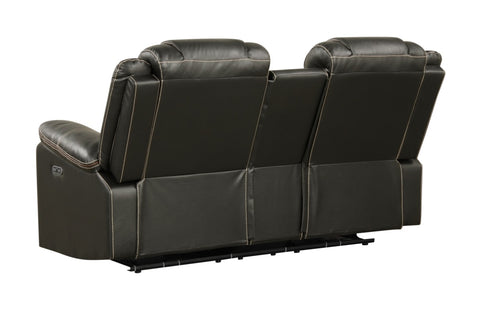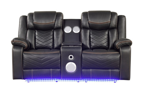Upgrade your relaxation experience with this stylish power reclining loveseat, designed for modern comfort and entertainment. Upholstered in premium faux leather, this loveseat features a sleek contrasting accent detail. Built-in Bluetooth speakers deliver immersive sound, making it perfect for movie nights or music streaming. The center console includes two cup holders and a hidden storage compartment to keep essentials close at hand. Power reclining functionality lets you find your perfect lounging position, while integrated USB ports ensure your devices stay charged. Completing the design, LED lighting at the base adds a stylish, ambient glow for a cinematic touch.