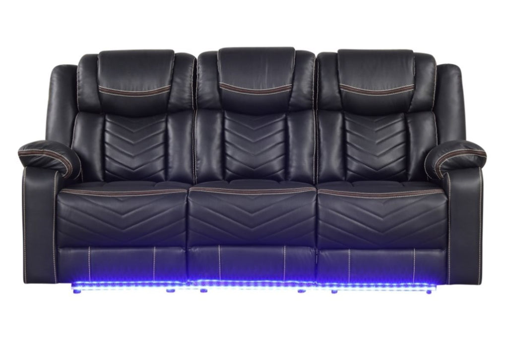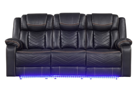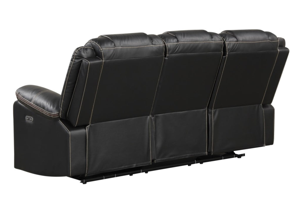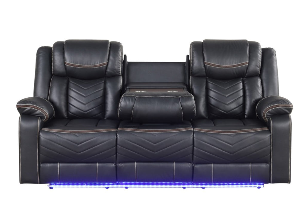Upgrade your living space with this modern power reclining sofa, designed for ultimate comfort and convenience. Upholstered in premium faux leather, this sleek sofa features a contrasting accent stitching for a contemporary touch. The dual power recliners on each corner allow you to kick back and relax at the push of a button, while the built-in USB ports keep your devices charged and within reach. A fold-down center console with cup holders and a smooth tabletop provides the perfect spot for drinks and snacks. Completing the experience, integrated LED lighting at the base creates an ambient glow, enhancing your entertainment setup.