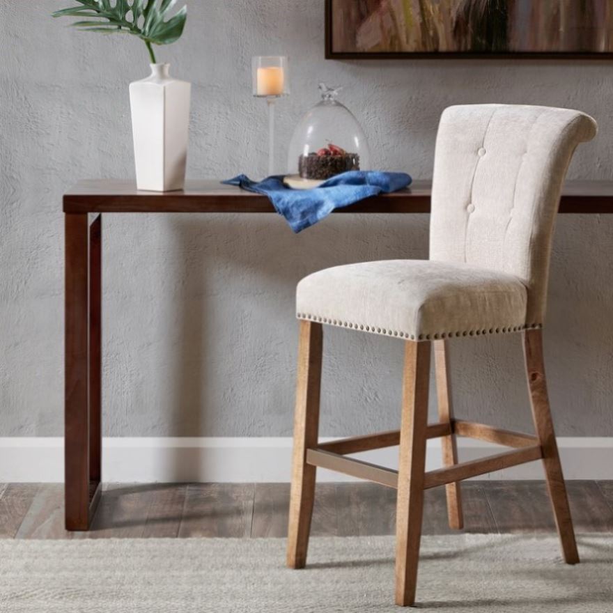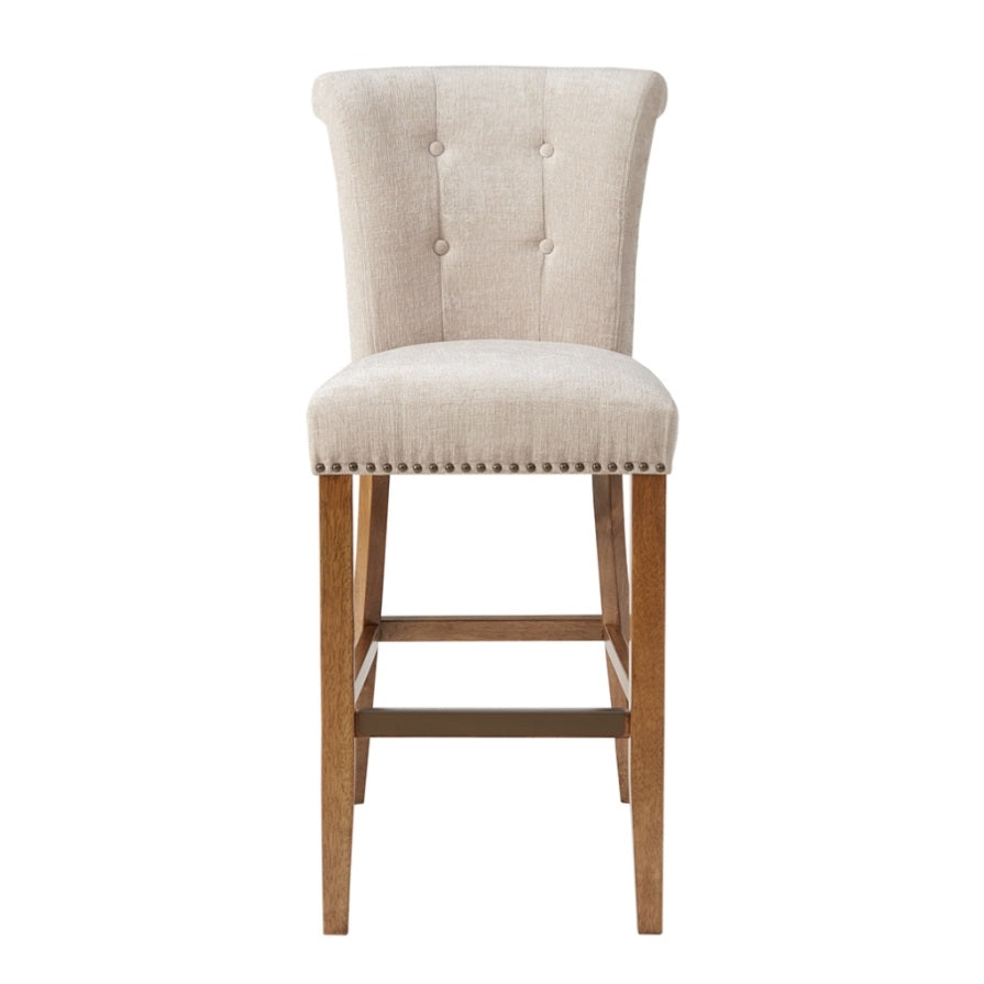 Elegant bronze nail heads add an extra touch of dignified style to this roll back button tufted bar stool. Assembly required.