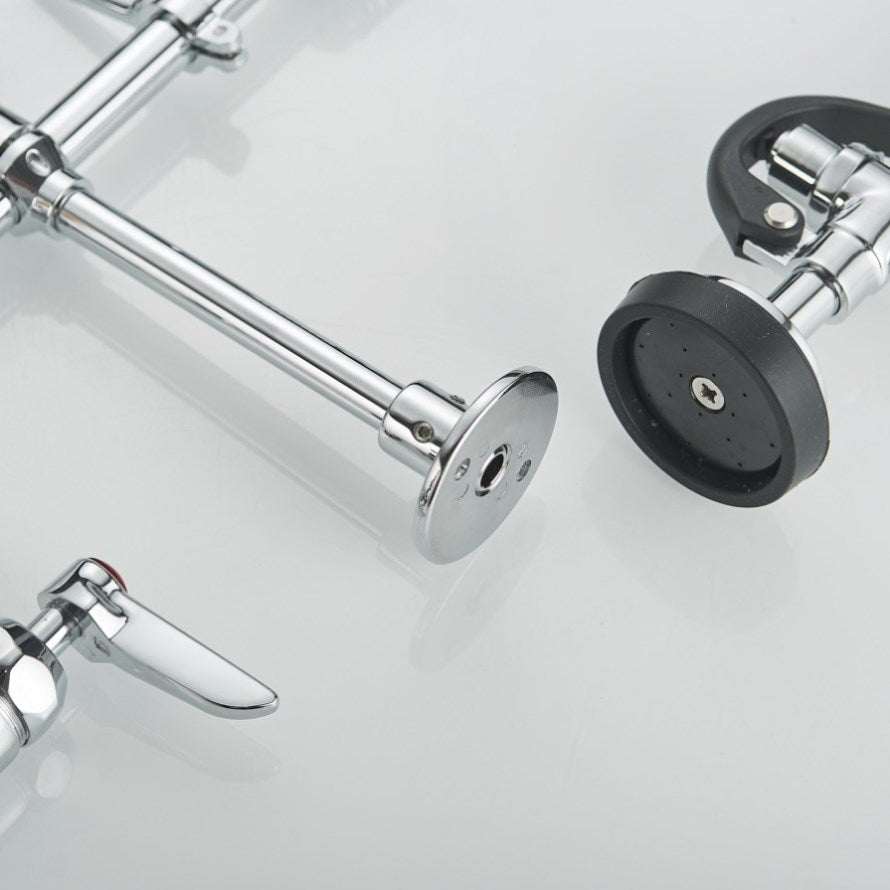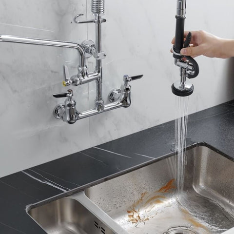 [Commercial Sink Faucet] - This deck mounted pre-rinse faucet with sprayer and add on faucet is perfect for rinsing excess food and sauces off of your dishes prior to running them through your commercial dish machine. Intended for janitorial and dishwashing use, this commercial kitchen faucet is ideal for dish rooms, schools, grocery stores, kitchens, and more.
