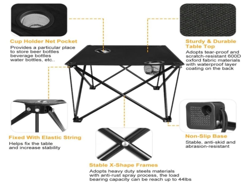 - *STURDY & DURABLE TABLE TOP: Made from thickened 600D abrasion-resistant polyester fabric materials, the table top of our table is tear-proof, scratch-resistant, abrasion-resistant and stain-resistant. And its back side is coated with waterproof layer to protect against water permeation.
