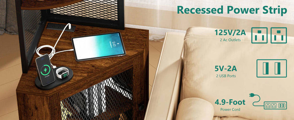 Corner Shelf with Charging Station: Tired of tangled wires Our corner storage cabinet comes with 2 AC outlets and 2 USB ports, 4.9-Foot Power Cord. It can charge your mobile phone, watch and other items, which greatly facilitates your life and keeps the surface of the corner cabinet neat and orderly.