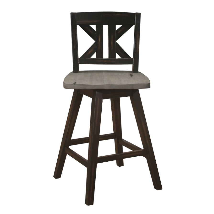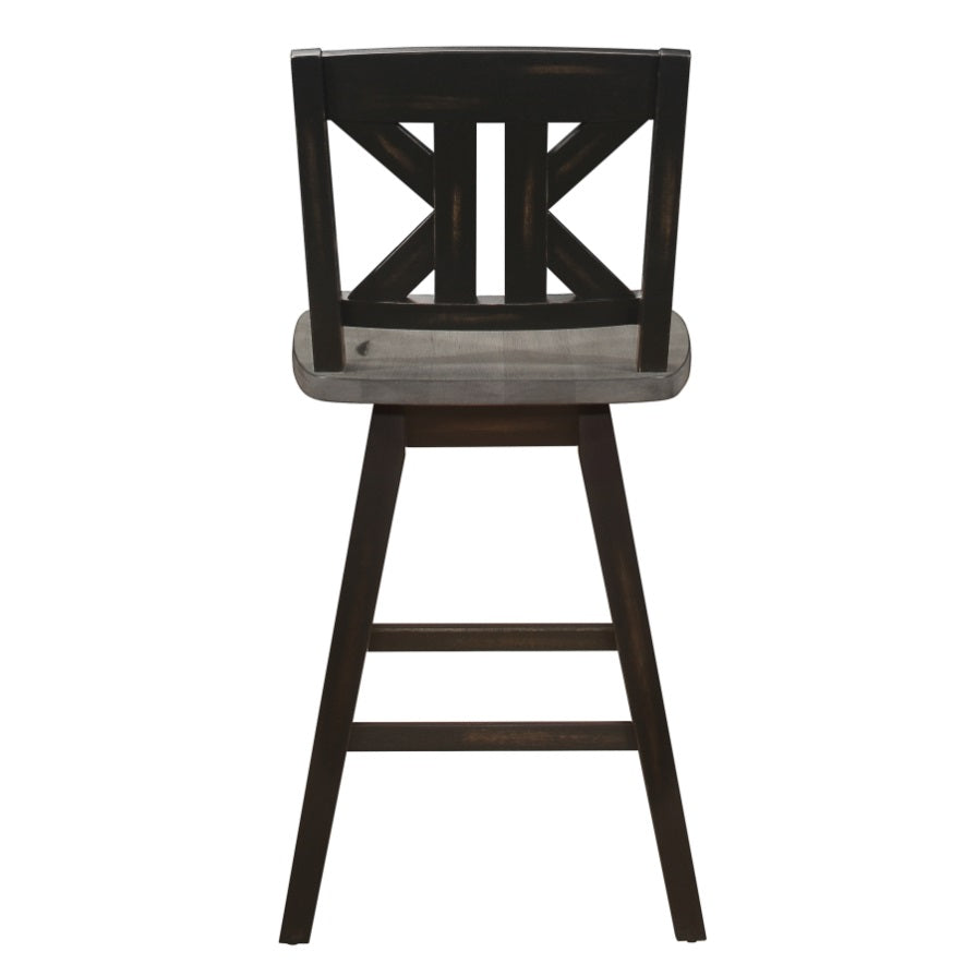 Creating a subtle rustic look for your dining space is the Amsonia Collection. A black sand-through finish graces the solid rubberwood 24-inch divided X-back swivel counter height chair, highlighting the veneer.