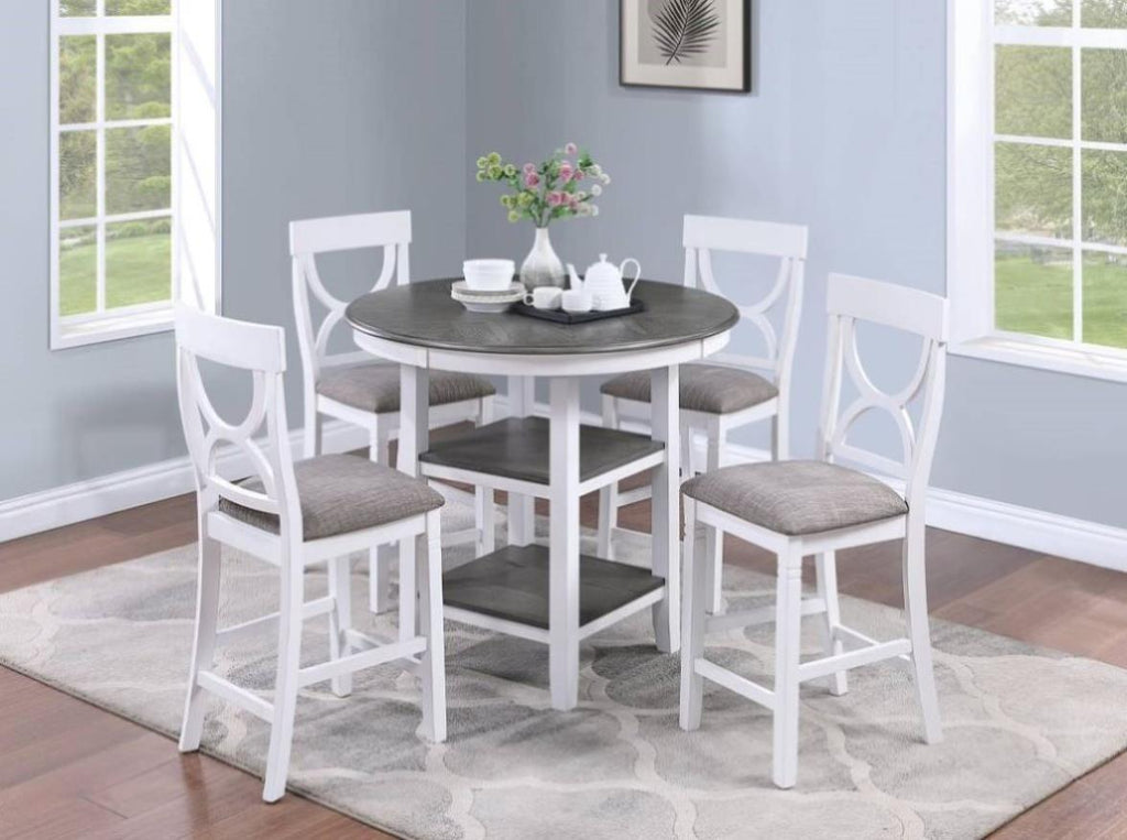 Enjoy your meals with this 5-piece Counter Height Dining set, which comes with 4 matching Dining Chairs, featuring nicely padded seats, an attractive curve-back chair design, and a footstool bar. The Dining Table features a gracefully rounded table oak veneer finish with decorative and functional shelves. Available in different colors.