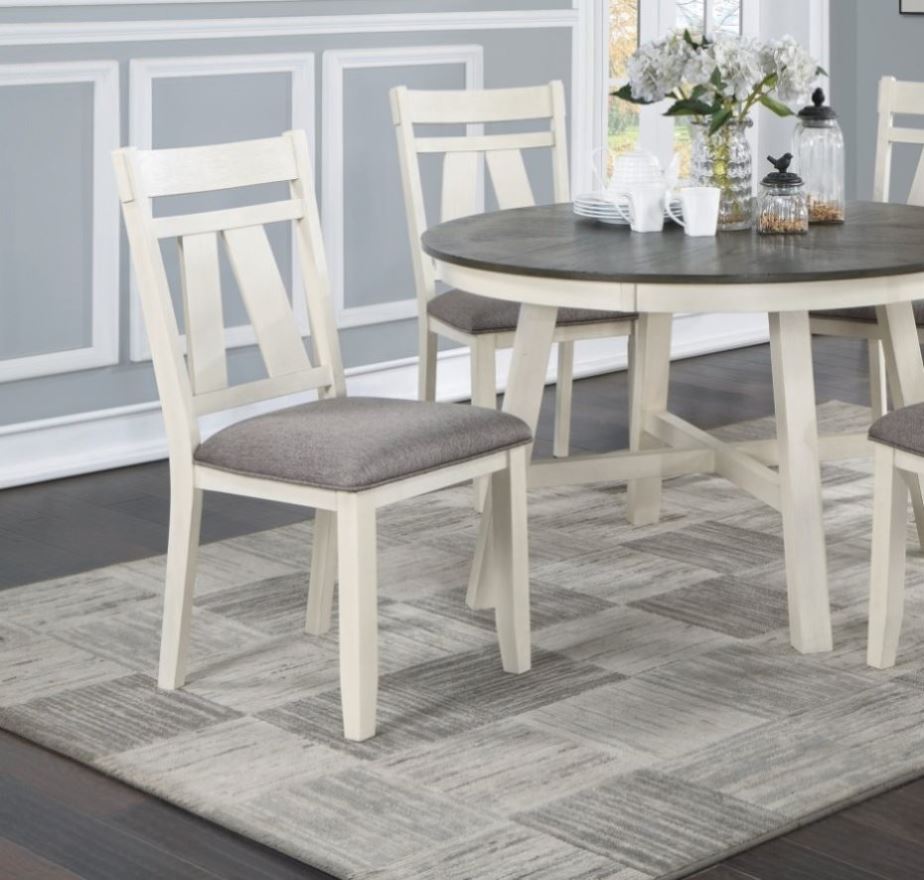 Enjoy your favorite cuisine with the decor of modern farmhouse. The round table with a gray wood tabletop framed in white features seating for up to four. The set also includes four chairs upholstered with gray seat cushions and trimmed in white clean lines.