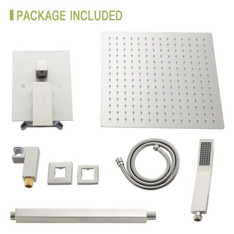 {Included Components}10 inch Square rain shower head,Shower Arm, handheld shower head, 59" shower hose,shower holder, water control valve,Parts and installation instructions.