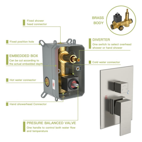 {Anti-scald Pressure-Balanced Valve}The Pressure-Balanced Valve has two check valves, which effectively eliminate water hammer noise and prevent scalding due to sudden fluctuations in hot or cold water temperatures.