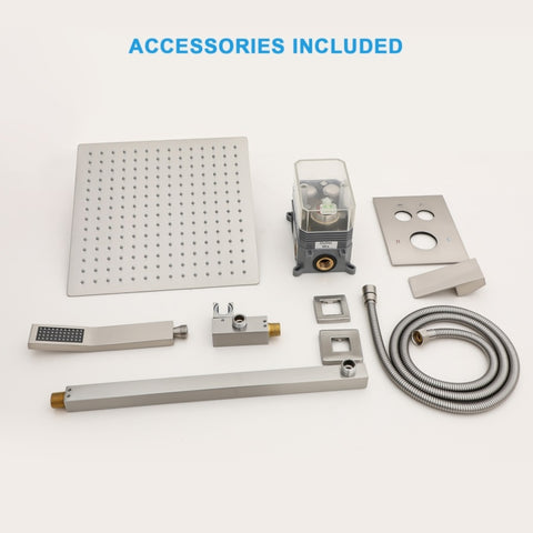 {Included Components}10 inch Square rain shower head,Shower Arm, handheld shower head, 59" shower hose,shower holder, water control valve,Parts and installation instructions.