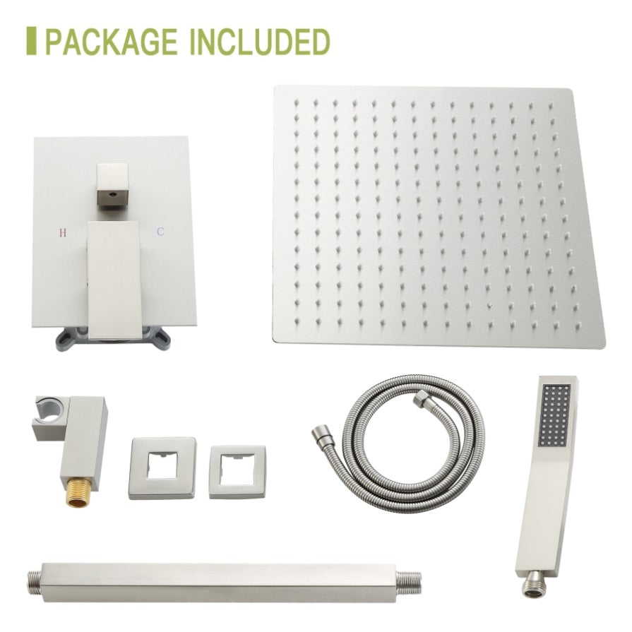 {Included Components}16 inch Square rain shower head,Shower Arm, handheld shower head, 59" shower hose,shower holder, water control valve,Parts and installation instructions.