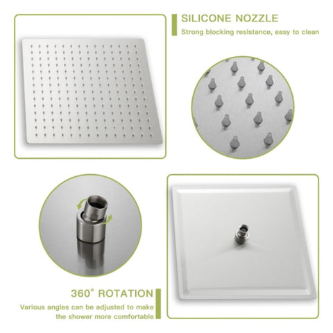 1. Product type: Dual shower head shower set 2. Mounting / Installation Type: Ceiling Mount 3. Adjustable water flow: Yes 4. Max Flow Rate (GPM): 1.8 5. Primary Material: stainless steel, brass 6. Finish: Brushed Nickel 7. Spray Pattern: Rain 8. Swivel: Yes 9. Shower Head Shape: Square 10. Hand Shower Included: Yes 11. Shower Arm Included: Yes 12. Hose Included: Yes 13. Flange/Escutcheon Included: Yes 14. Diverter Required: Yes 15. Required Valve Type: Pressure Balanced 16. Rough-in Valve Included: Yes 17. Number of Spray Patterns: 1 18. Number of Shower Heads: 2 19. Handheld shower: ABS plastic material 20. Hose: 304 stainless steel
