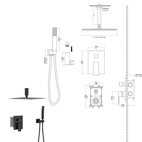 {Included Components}16 inch Square rain shower head,Shower Arm, handheld shower head, 59" shower hose,shower holder, water control valve,Parts and installation instructions.