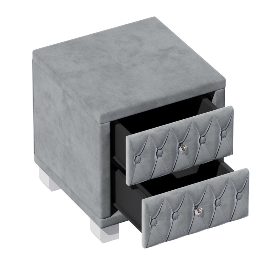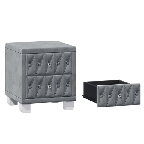 Elevate your bedroom with this nightstand, a perfect blend of sophistication and functionality. Featuring a soft, luxurious velvet finish, this bedside table boasts two spacious drawers adorned with sparkling crystal handles, adding a touch of glamour to any interior. The button-tufted design enhances its timeless appeal, while the sturdy construction ensures durability. With ample storage space, it's ideal for keeping essentials close at hand while maintaining an uncluttered look. Whether placed beside your bed or in a living area, this stylish nightstand is both a practical and elegant addition to your home decor.