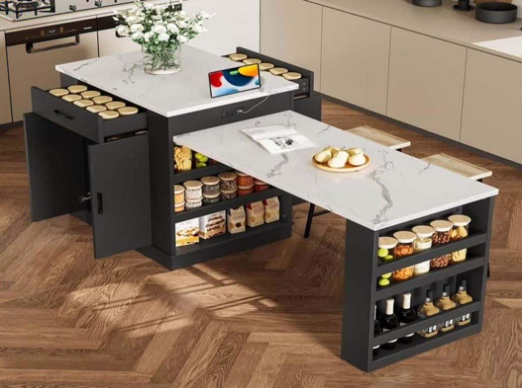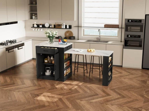 This island serves as both a cooking and prep area and can transform into a compact breakfast bar, an elegant tea table for afternoon gatherings, or even a transitional partition between kitchen and dining room. Its abundant storage features—including drawers, double-door cabinets, and open shelving—offer versatile solutions for diverse lifestyle needs. This organized storage system keeps kitchen essentials clearly categorized and within easy reach. The extended countertop provides additional space for food prep, baking, and other tasks. When multiple people are working simultaneously, it ensures each person has their own dedicated workspace, significantly boosting cooking efficiency. Its sleek, modern aesthetic effortlessly complements various kitchen decor styles while elevating the overall aesthetic appeal.