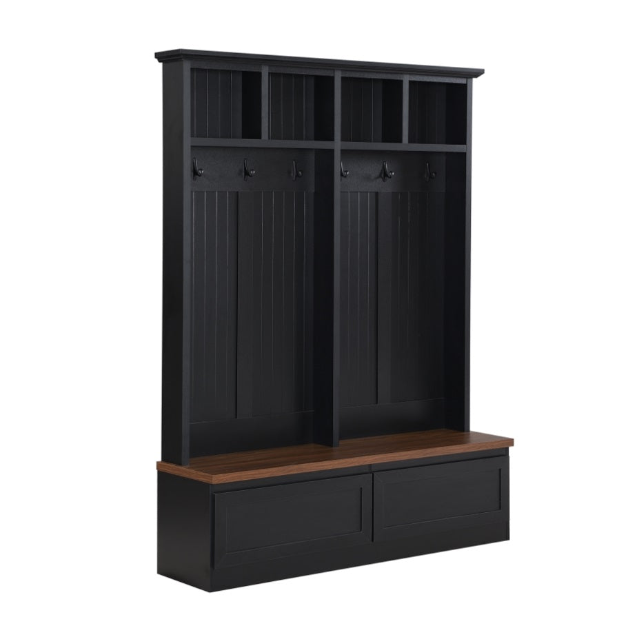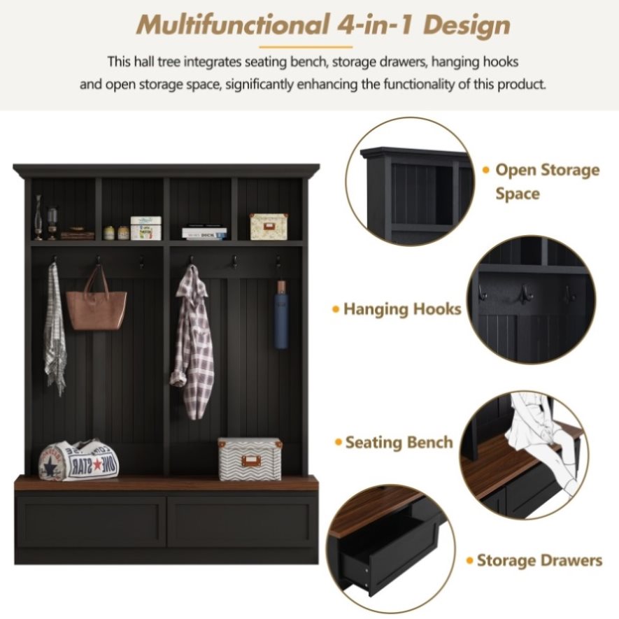 This hall tree integrates seating bench, storage drawers, hanging hooks and open storage space, significantly enhancing the functionality of this product and providing a comprehensive solution for organizing your entry or hallway area.
