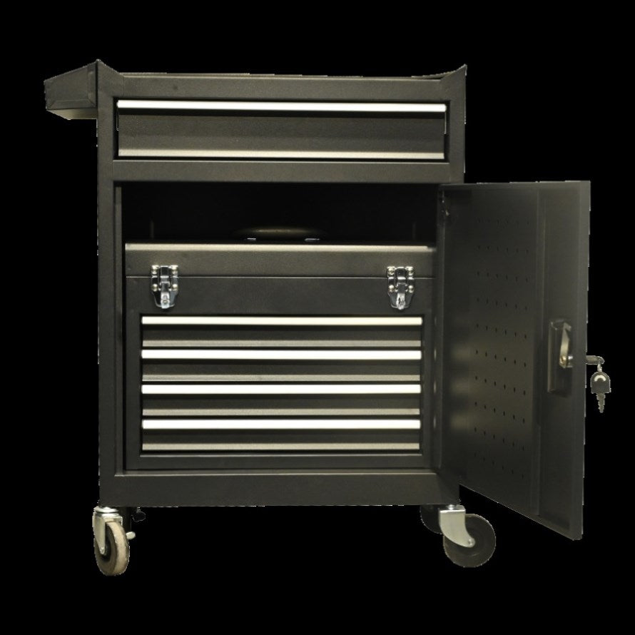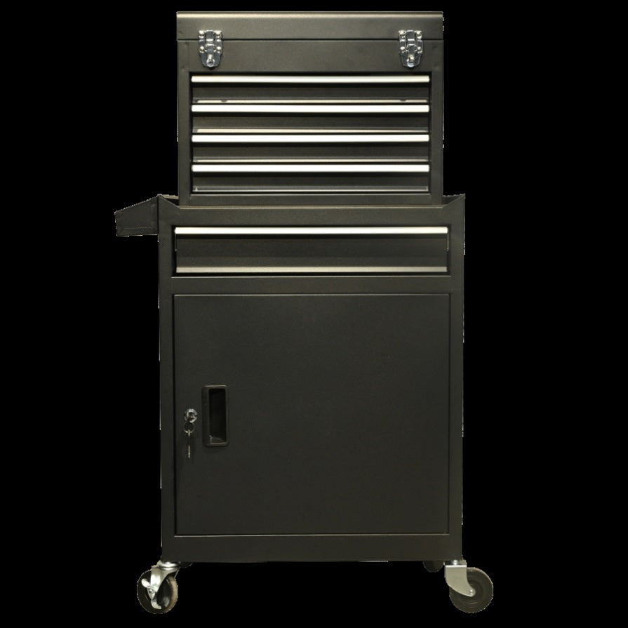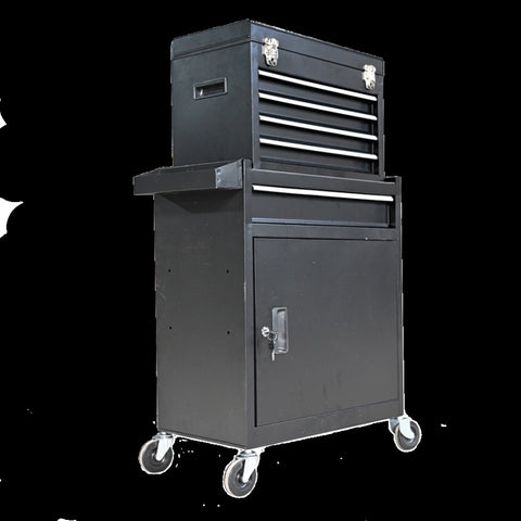 The combination tool cart has 5 drawers, 1 base cabinet, and hook holes, which can be used and have a large storage space.