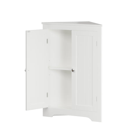 The corner cabinet features one adjustable interior shelf holding a variety of items, two beadboard doors, and silver knobs adding style and charm to This multipurpose Free-standing Floor cabinet.