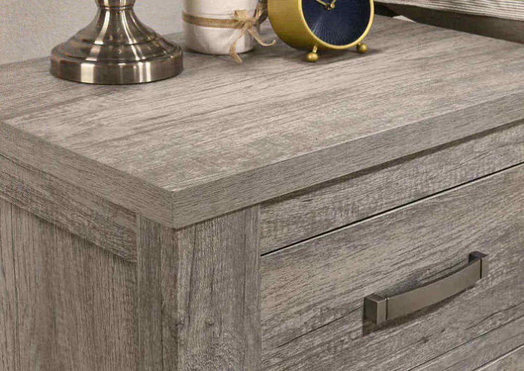 Features sleek, clean silhouette in a weather gray finish with wood grain pattern