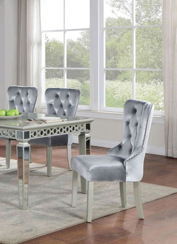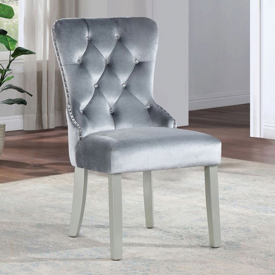 Dining in style is easy with this fabulous chair. Padded flannelette adds comfort to the chic design with its tufted wingback, nailhead trim, and soft gray tones.