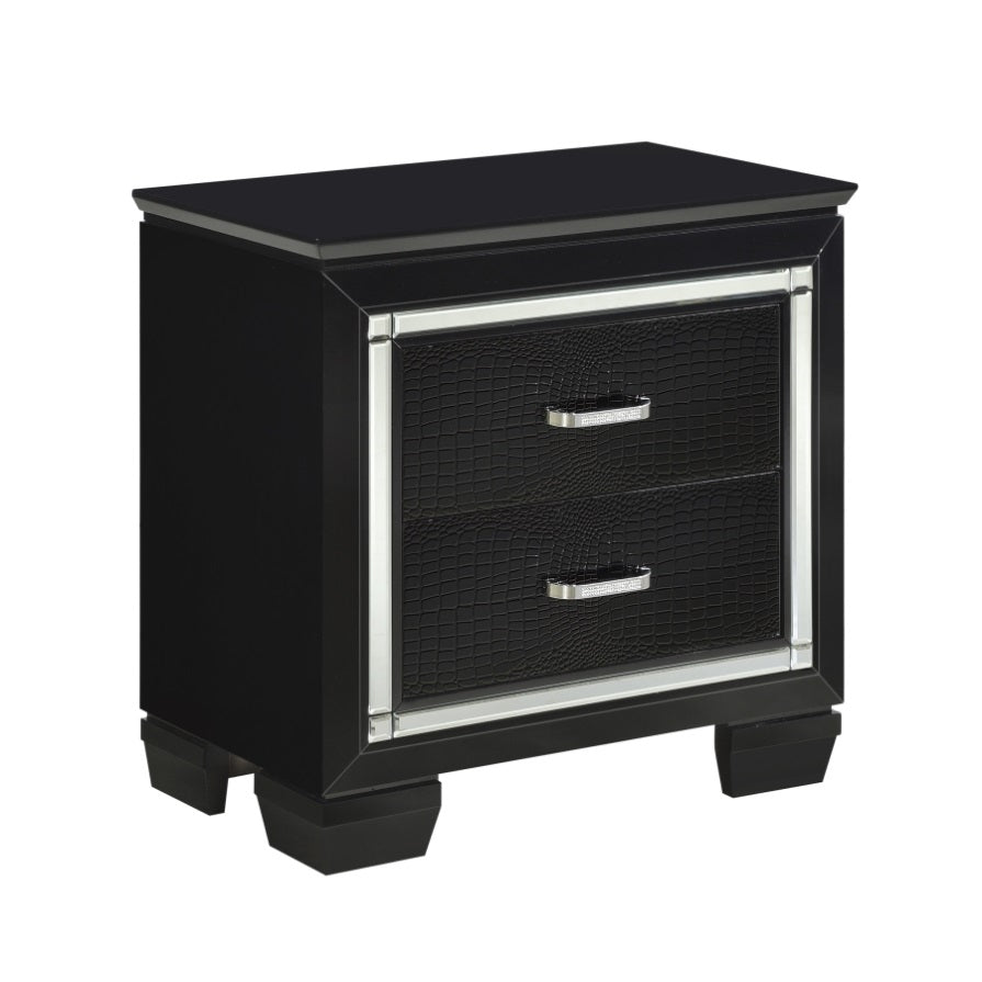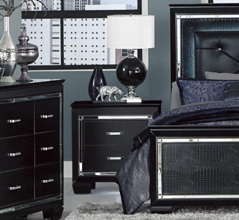 Glamour reigns in the design of this Collection. Framing the nightstand is a decorative beveled mirror accent that enhances the the under-light of the night stand. Alligator embossing and high polished crystal-enhanced hardware boldly accent the black finish.
