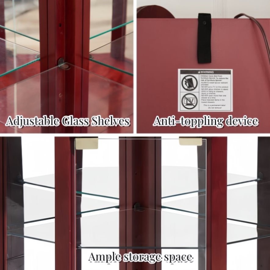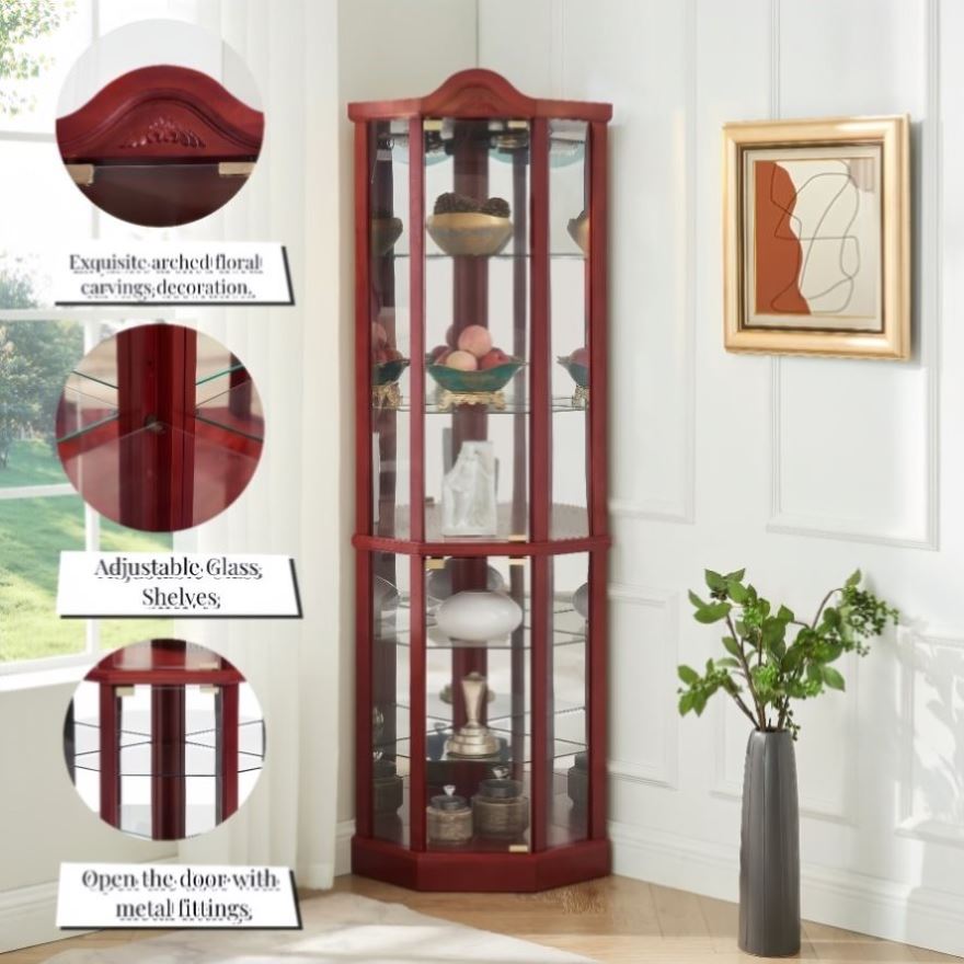 Storage Space: Featuring 4 adjustable tempered glass shelves, this corner curio cabinet provides ample storage space for your prized collectibles. The flexibility of the adjustable shelves allows you to elegantly showcase your items in the most optimal manner possible. Furthermore, the removable tempered glass shelves offer the versatility to display taller items as needed, adding a touch of sophistication to your collection.