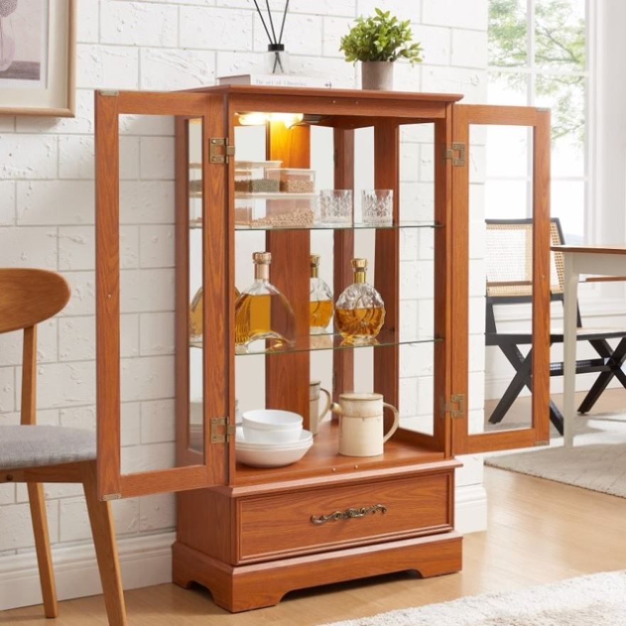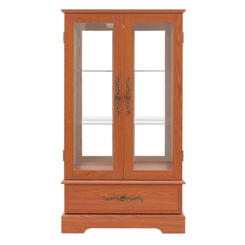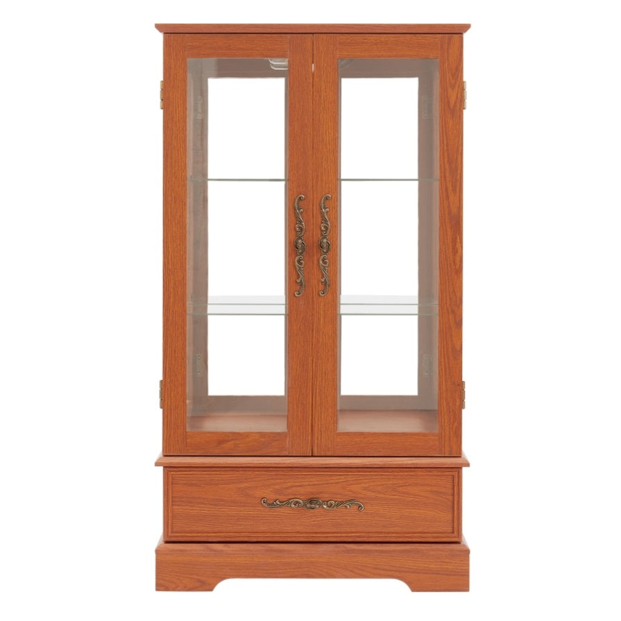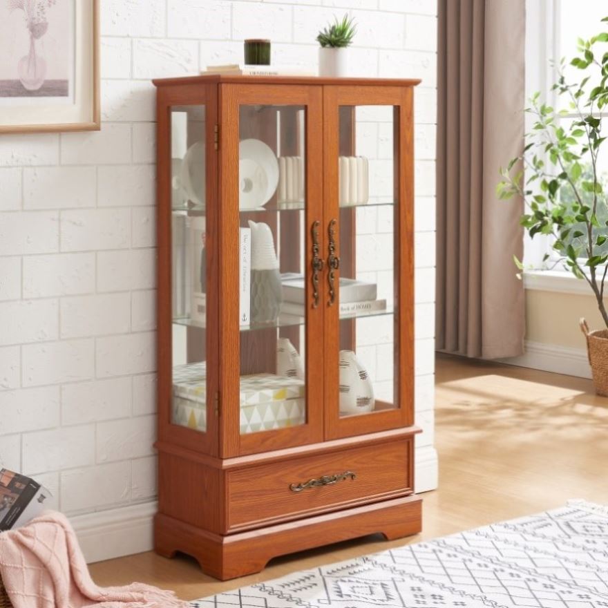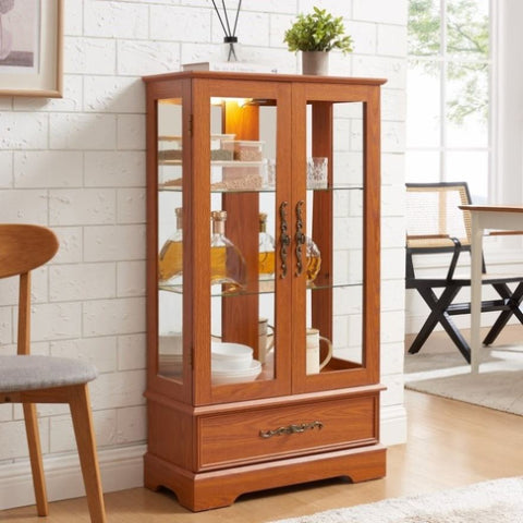 Spacious and Elegant Cabinet:This exquisite curio cabinet, featuring glass doors, boasts a total of 3 shelves and a big drawer that offer ample and versatile storage space. It includes one fixed wooden shelf and two adjustable tempered glass shelves, each capable of holding between 15 to 22 pounds. This cabinet is perfect for storing books、wine、 or collectibles.