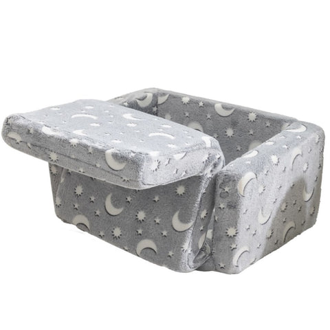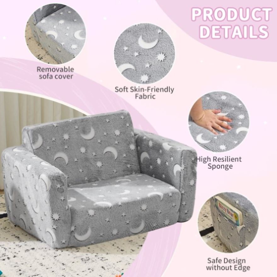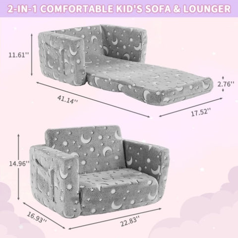 Create a dreamy and functional space for your child with this Glow-in-the-Dark All-Sponge Sofa Bed. Upholstered in premium light grey flannel adorned with a celestial star and moon pattern that glows magically at night, it sparks imagination and provides a comforting presence. Its 100% sponge construction ensures complete safety and plush comfort, free from any hard frames. The versatile design effortlessly folds down from a cozy sofa into a single bed, making it perfect for quiet time, reading, or overnight adventures.