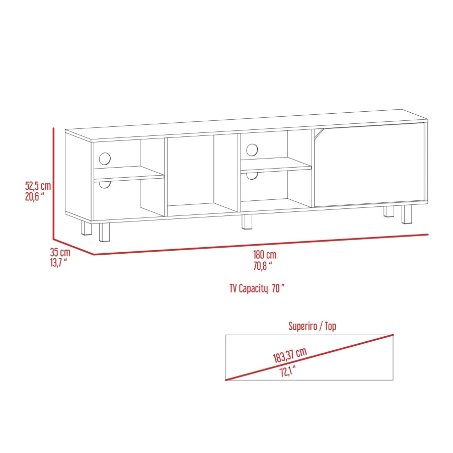 This unit offers four open shelves for versatile storage and display, plus back holes for easy cable management. With five legs for support, it accommodates TVs while blending functionality with a sleek design.