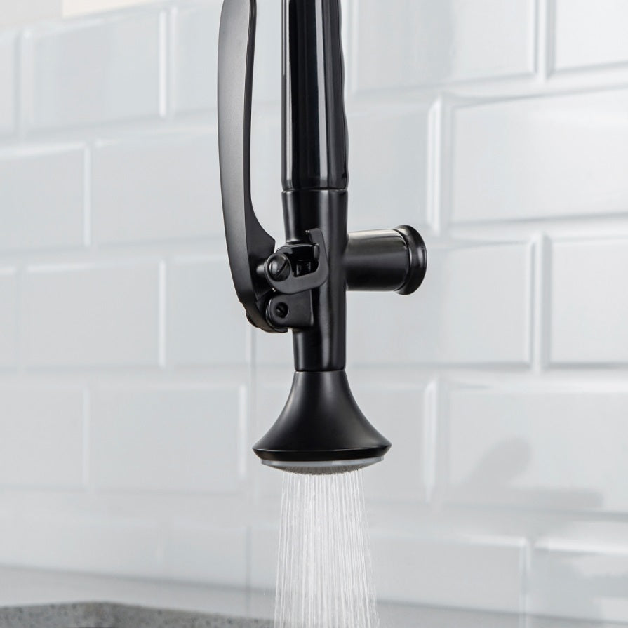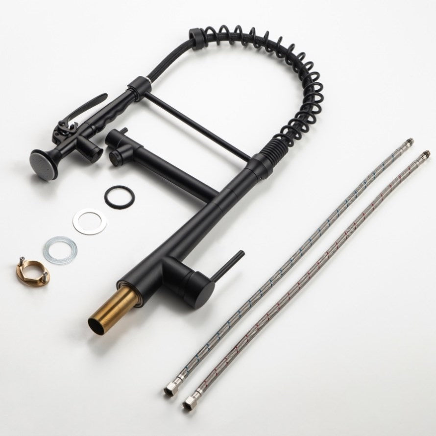 Spot Free----Matte Black finish; Solid brass lead free construction, superior rust-resistant. Unique Design----Heavy duty commercial style spring design, suitable for big sink or granite counter tops. 2 Function Spout----Commercial Style Pre-Rinse Kitchen Faucet with Pull-Down Spring Spout and Pot Filler, 360 degree rotation, both nozzles have their own control.