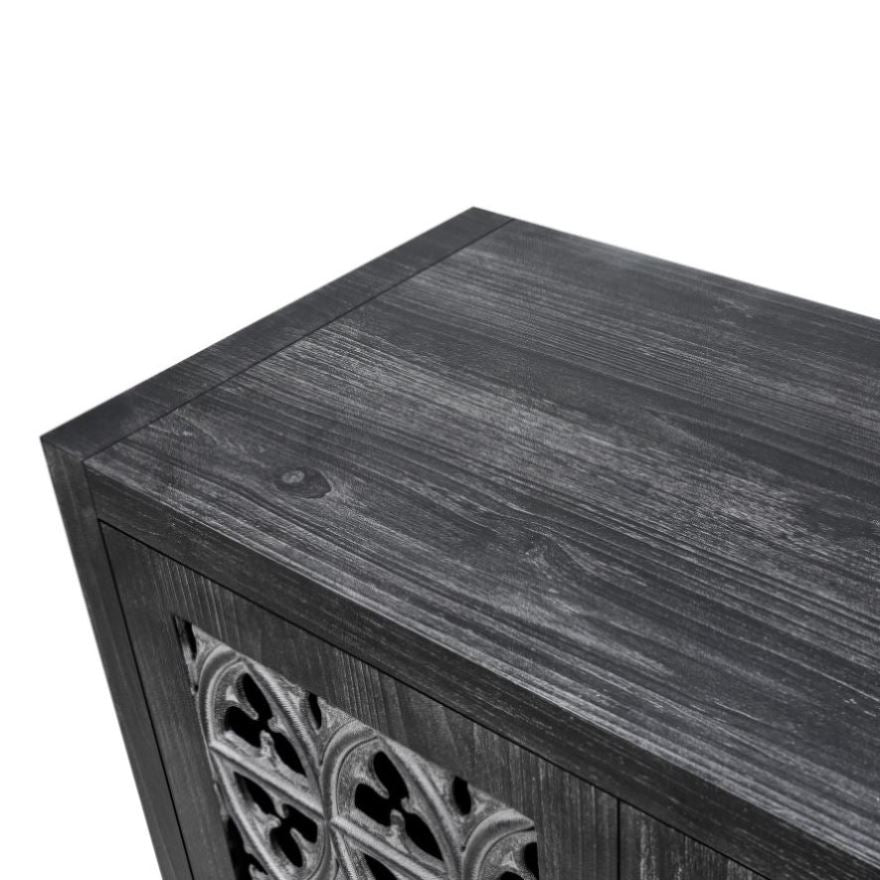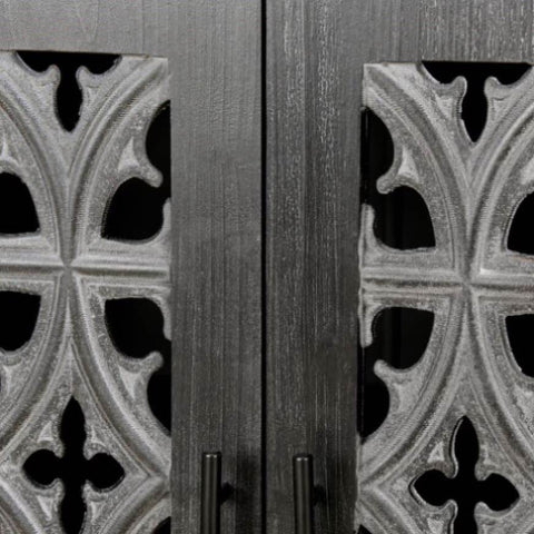 [Design]:The wooden hollowed out door design makes the cabinet show a unique aesthetic. The design of hollowed-out doors not only increases the lightness of the cabinet, but also provides ventilation and display opportunities for the interior items. The use of symmetrical floral patterns, on the other hand, makes the cabinet more balanced and harmonious, giving it a sense of comfort and pleasure.