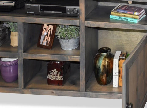 This 84 inch TV Stand Console boasts a striking and modern take on rustic charm. Skillfully crafted from Knotty Alder solids and veneers, this entertainment center is finished in a rich Barnwood with classic hammered Bronze hardware. Featuring two panel doors and five shelves, this TV Stand will accommodate TVs up to 95 inches and provide ample storage for media and gaming consoles and home décor favorites. Cable management openings on the back panel will keep your cords and wires concealed. Fully assembled upon arrival, this piece is ready to unbox and enjoy. Bring home this high-quality TV Console for a picturesque upgrade in your living room.